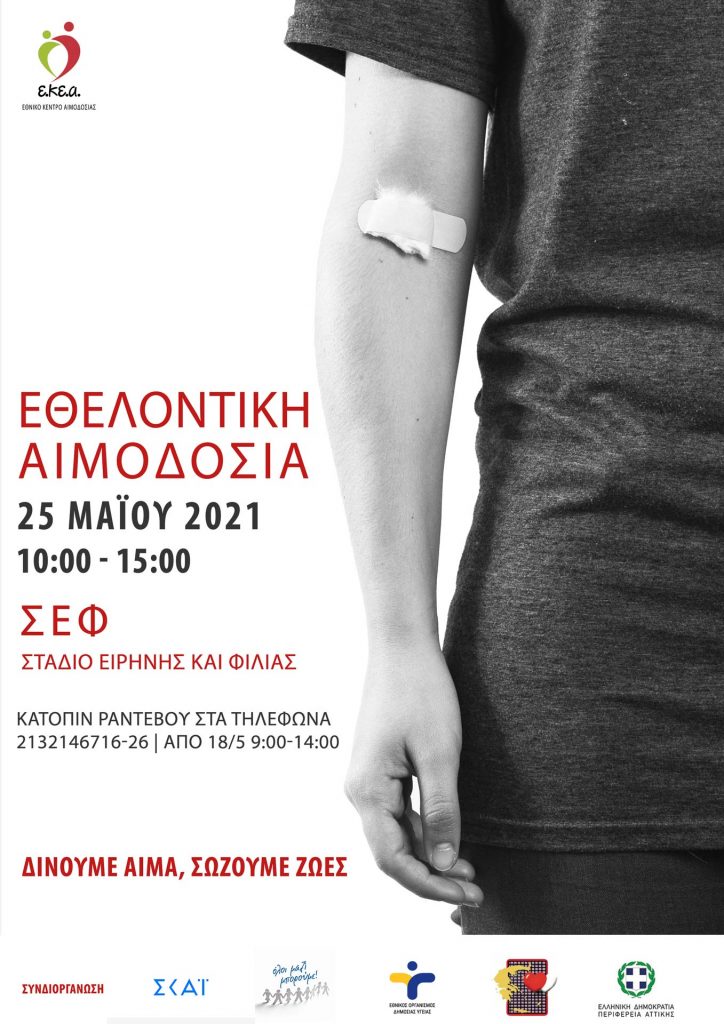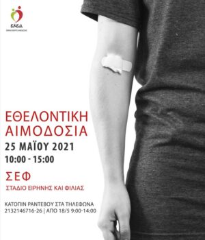 Το Ε.ΚΕ.Α. με πλήρη συναίσθηση της ευθύνης του για την ασφάλεια του αίματος και των αιμοδοτών, αλλά και για την επάρκεια των αποθεμάτων αίματος της χώρας διοργανώνει σε συνεργασία με τον τηλεοπτικό σταθμό «ΣΚΑΪ», το «Όλοι Μαζί Μπορούμε», τον Εθνικό Οργανισμό Δημόσιας Υγείας (ΕΟΔΥ), την Περιφέρεια Αττικής και την Πανελλήνια Ομοσπονδία Συλλόγων Εθελοντών Αιμοδοτών (Π.Ο.Σ.Ε.Α.), δράση εθελοντικής αιμοδοσίας στο Στάδιο Ειρήνης και Φιλίας, την Τρίτη 25 Μαΐου από τις 10:00 το πρωί έως τις 15:00 το απόγευμα.
