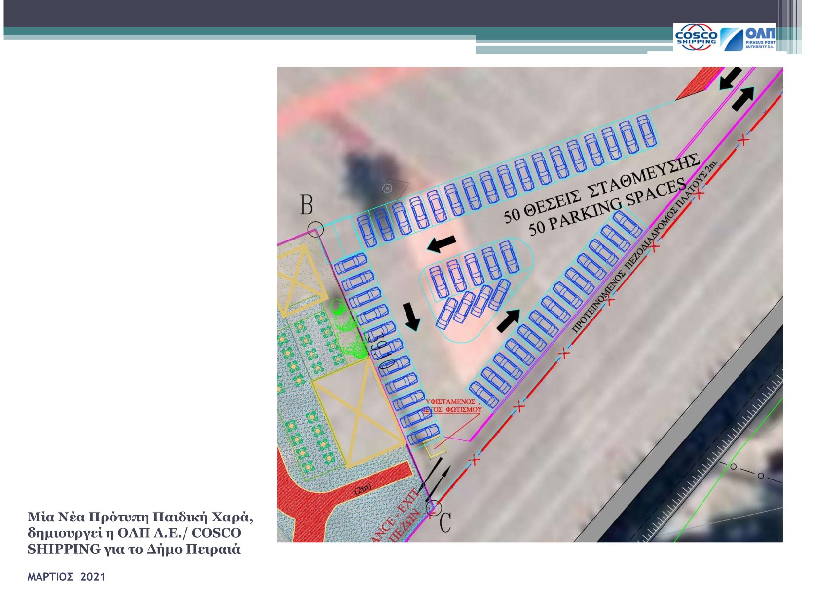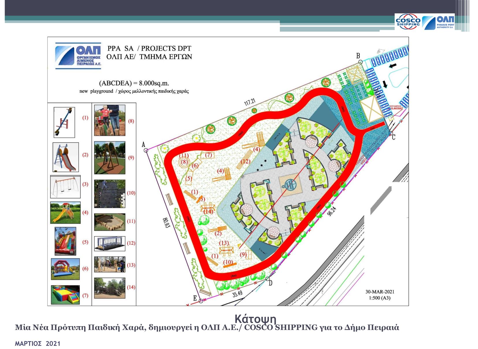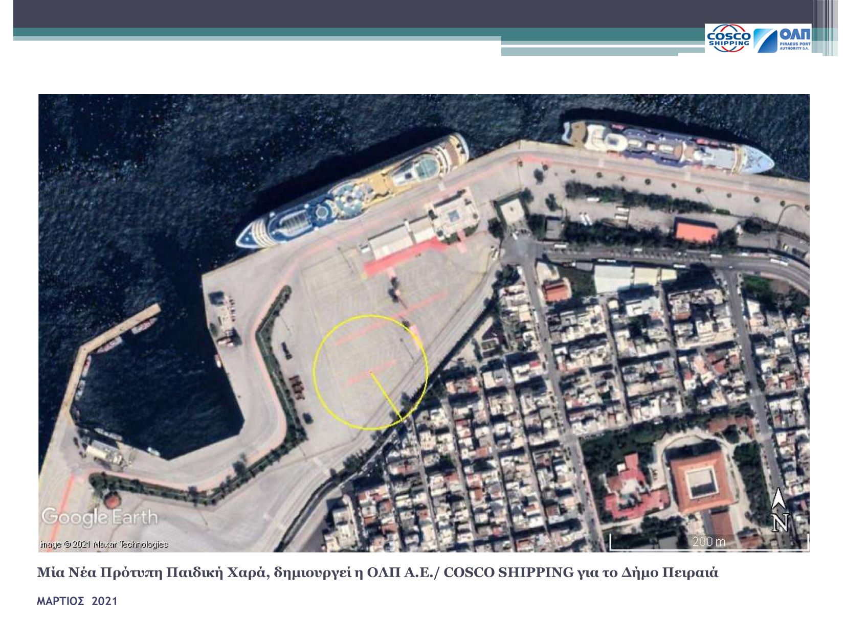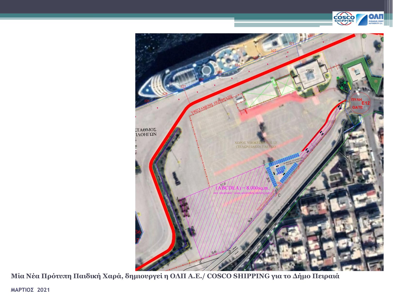 Πιο συγκεκριμένα, ο ΟΛΠ θα μετατρέψει μια έκταση 8.000 τ.μ. (εκτός του επιπλέον χώρου στάθμευσης) στον τερματικό σταθμό κρουαζιέρας σε ανοιχτό χώρο και σύγχρονη παιδική χαρά σύμφωνα με υψηλά περιβαλλοντικά πρότυπα και προδιαγραφές ασφαλείας, η οποία θα ικανοποιήσει τις ανάγκες των πολιτών της γύρω περιοχής. Η πρόσβαση στη νέα παιδική χαρά θα μπορεί να πραγματοποιηθεί με τα πόδια, με τη δημόσια συγκοινωνία ή με αυτοκίνητο, καθώς θα υπάρχει και χώρος πάρκινγκ με 50 θέσεις στάθμευσης.