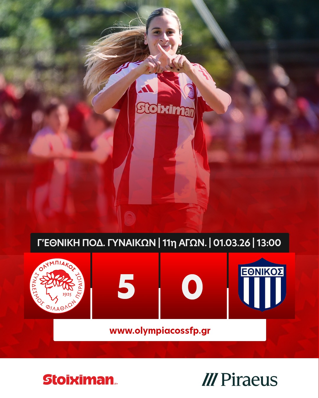 Με απόλυτη κυριαρχία και εντυπωσιακή συνέπεια, η γυναικεία ομάδα ποδοσφαίρου του Ολυμπιακού συνεχίζει να εντυπωσιάζει στο φετινό πρωτάθλημα. Η ευρεία νίκη με 5-0 απέναντι στον Εθνικό την Κυριακή (1/3) δεν ήταν απλώς μία ακόμη επιτυχία, αλλά το αποτέλεσμα που «σφράγισε» και μαθηματικά την άνοδο, τρεις αγωνιστικές πριν την ολοκλήρωση της σεζόν.