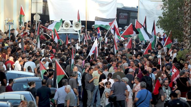 Μαζική διαμαρτυρία για την άφιξη Ισραηλινών τουριστών έλαβε χώρα το πρωί στην Πύλη Ε12 του λιμανιού του Πειραιά , πύλη που έδεσε το Ισραηλινών συμφερόντων Crown Iris