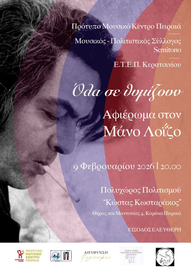 Μια ξεχωριστή συναυλία – αφιέρωμα στον σπουδαίο μουσικοσυνθέτη Μάνο Λοΐζο και την προσφορά του στο έντεχνο λαϊκό τραγούδι, θα πραγματοποιηθεί σήμερα Δευτέρα 9 Φεβρουαρίου 2026, στις 20:00, στον Πολιτιστικό Πολυχώρο «Κώστας Κωσταράκος», στα Καμίνια (Θήρας και Μαντινείας 4), με ελεύθερη είσοδο.