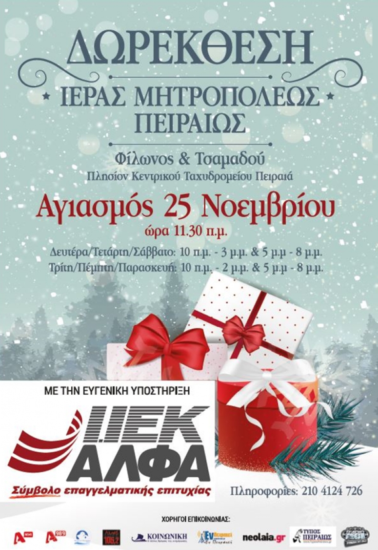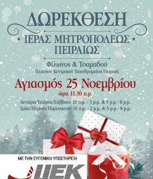 Η Δωροέκθεση, ο θεσμός που στηρίζει το φιλανθρωπικό έργο που επιτελεί η τοπική μας Εκκλησία, θα λειτουργήσει και φέτος στο κτήριο επί των οδών Τσαμαδού και Φίλωνος έναντι Κεντρικού Ταχυδρομείου Πειραιώς.