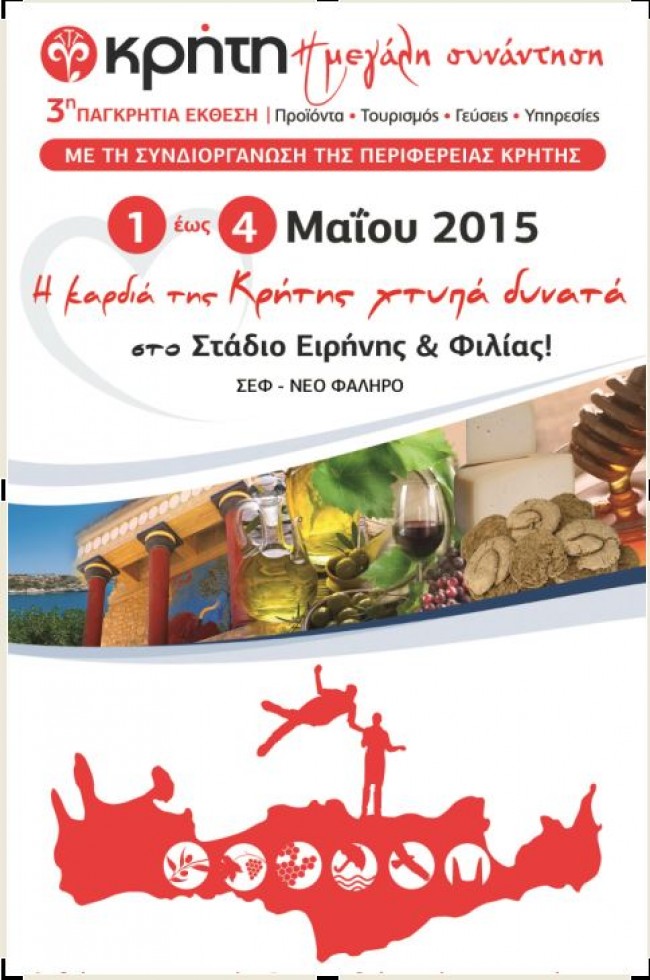 Με την συνδιοργάνωση της Περιφέρειας Κρήτης, των Επιμελητηρίων του νησιού, και την στήριξη όλων των δήμων της Κρήτης, παραγωγικών τάξεων και φορέων, θα πραγματοποιηθεί η 3η Παγκρήτια Έκθεση «ΚΡΗΤΗ: Η ΜΕΓΑΛΗ ΣΥΝΑΝΤΗΣΗ» από 1 έως 4 Μάιου 2015 στο στάδιο Ειρήνης και Φιλίας στο Νέο Φάληρο στην Αθήνα. Η έκθεση που προβάλλει τα προϊόντα, τον τουρισμό, τις υπηρεσίες και τον πολιτισμό του νησιού, παρουσιάστηκε σήμερα στην Περιφέρεια Κρήτης στο πλαίσιο συνέντευξης τύπου με την παρουσία του Περιφερειάρχη Κρήτης Σταύρου Αρναουτάκη, της Αντιπεριφερειάρχη Κρήτης πρωτογενή τομέα Θεανώς Βρέντζου-Σκορδαλάκη, του Προέδρου της Αγροδιατροφικής Σύμπραξης Περιφέρειας Κρήτης Μανόλη Χνάρη, του Προέδρου του Επιμελητηρίου Ηρακλείου Μανόλη Αλιφιεράκη, του μέλους της διοίκησης του Επιμελητηρίου Ηρακλείου Μαρίας Πιτσικάκη, και του διοργανωτή Νεκτάριου Σερμάκη.