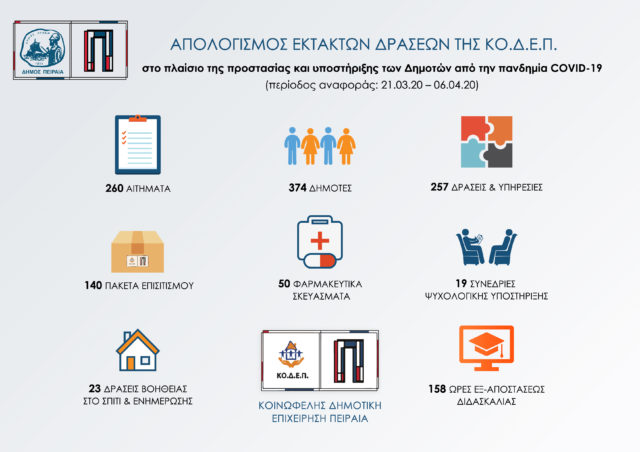 Στο πλαίσιο αυτό, τις τελευταίες δύο εβδομάδες η Κοινωφελής Δημοτική Επιχείρηση Πειραιά υποστήριξε μέσω των κοινωνικών της υπηρεσιών 374 δημότες, κατέγραψε και υλοποίησε 260 αιτήματα συνανθρώπων μας καλύπτοντας διάφορες ανάγκες και πραγματοποίησε 257 δράσεις και υπηρεσίες, με στόχο την καλύτερη δυνατή διαβίωση και την προστασία της υγείας των δημοτών.