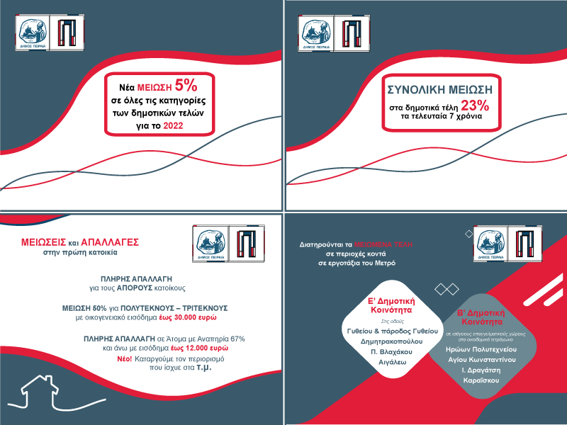 O Δήμος Πειραιά προχωρά για ακόμα μια χρονιά σε σημαντικές και μεγάλες μειώσεις καθώς και σε οικονομικές ελαφρύνσεις στα ανταποδοτικά τέλη, δείχνοντας το κοινωνικό του πρόσωπο, με στόχο τη στήριξη των δημοτών, των επιχειρήσεων και των ευπαθών ομάδων της πόλης μας.