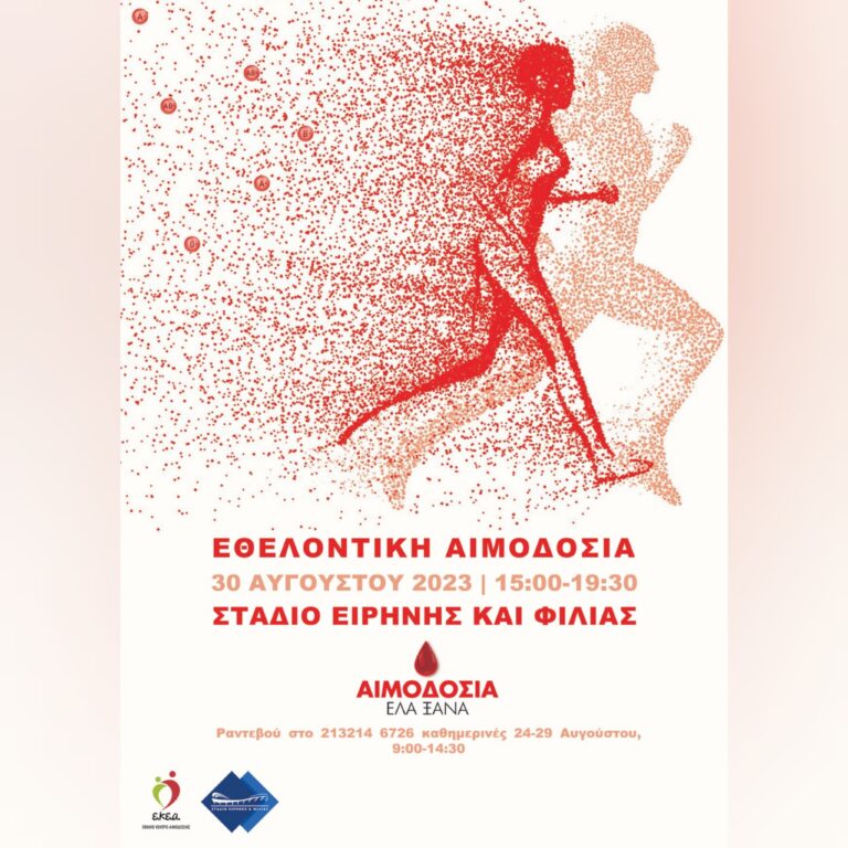 ο Στάδιο Ειρήνης και Φιλίας και το Εθνικό Κέντρο Αιμοδοσίας συνδιοργανώνουν, την Τετάρτη 30 Αυγούστου και ώρες 15:00-19:30, δράση εθελοντικής αιμοδοσίας, έξω από την αίθουσα Μελίνα Μερκούρη (Είσοδος θύρα δημοσιογράφων, Λ. Εθνάρχου Μακαρίου 1, Νέο Φάληρο).