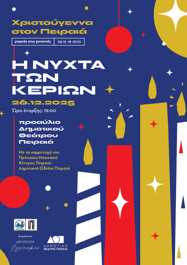 Η Διεύθυνση Πολιτισμού του Δήμου Πειραιά σας προσκαλεί στη μοναδική μουσική βραδιά «Νύχτα των Κεριών», που θα πραγματοποιηθεί την Παρασκευή 26 Δεκεμβρίου 2025, στις 19:00, στο προαύλιο του Δημοτικού Θεάτρου Πειραιά. Η εκδήλωση, διάρκειας 120 λεπτών, θα φωτιστεί αποκλειστικά από εκατοντάδες κεριά, δημιουργώντας μια ζεστή, μαγική και κατανυκτική ατμόσφαιρα. Το πρόγραμμα, με τη συμμετοχή του Προτύπου Μουσικού Κέντρου Πειραιά – Δημοτικού Ωδείου Πειραιά, περιλαμβάνει αγαπημένες χριστουγεννιάτικες μελωδίες που συνδυάζουν κλασικές και σύγχρονες συνθέσεις.