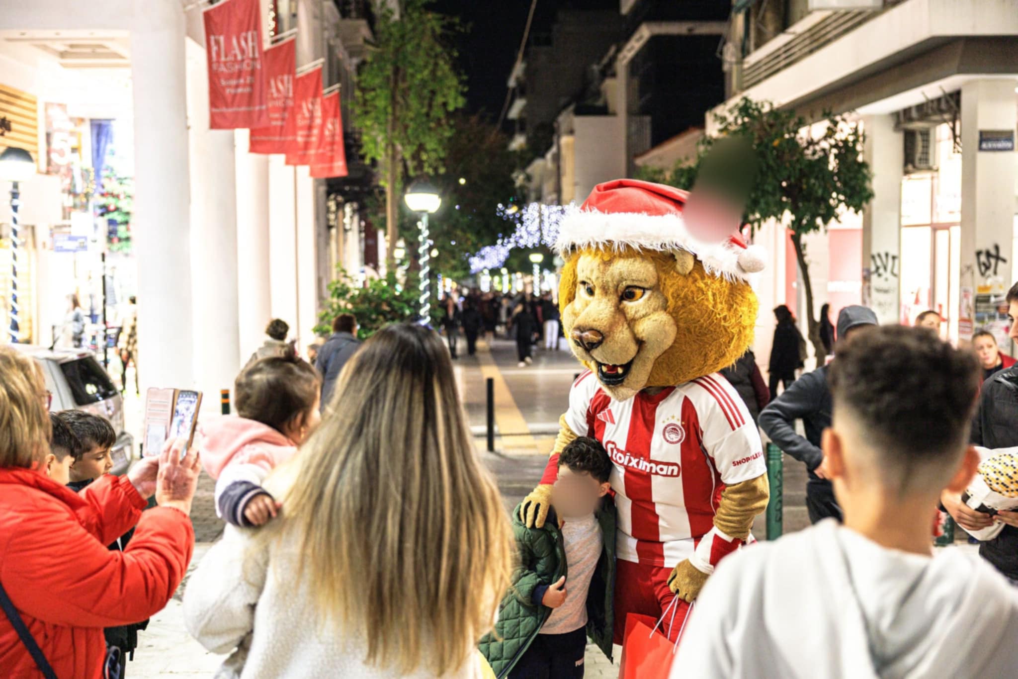 Οι δρόμοι αντηχούσαν από χριστουγεννιάτικες μελωδίες της Φιλαρμονικής Ορχήστρας Πνευστών του δήμου, ενώ η μασκότ του Ολυμπιακού έδινε τον «θρυλικό» ρυθμό της, χαρίζοντας όμορφες στιγμές στα παιδιά, φωτογραφίζοντας μαζί τους και μοιράζοντας συμβολικά δώρα.