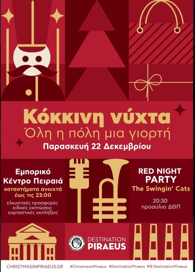 Στην «ΚΟΚΚΙΝΗ ΝΥΧΤΑ», που διοργανώνουμε σε συνεργασία με τον Δήμο Πειραιά, τα καταστήματα της πόλης μας παραμένουν ανοιχτά (προαιρετικά) μέχρι τις 11:00 το βράδυ με ελκυστικές προσφορές και ειδικές τιμές.