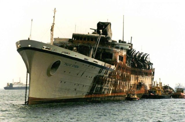 Σαν σήμερα το 1994, απο άγνωστη αιτία ξεσπά πυρκαγιά στο κρουαζιερόπλοιο “Παλλάς Αθηνά” της Ηπειρωτικής μόλις λίγες ημέρες πριν ξεκινήσει τις καθιερωμένες του κρουαζιέρες. Η παρακατω φωτογραφία του κου Γιάννη Μαντζούρη ,μπορεί να περιγράψει την κατάσταση.