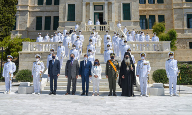 Στην τελετή παρέστησαν ο B’ Αντιπρόεδρος της Βουλής των Ελλήνων κ. Χαράλαμπος Αθανασίου ως εκπρόσωπος του Προέδρου της Βουλής των Ελλήνων, ο Υπουργός Εθνικής Άμυνας κ. Νικόλαος Παναγιωτόπουλος, ο Υφυπουργός Εθνικής Άμυνας κ. Αλκιβιάδης Στεφανής, ο Αρχηγός ΓΕΕΘΑ Στρατηγός Κωνσταντίνος Φλώρος, ο Αρχηγός ΓΕΑ Αντιπτέραρχος (Ι) Γεώργιος Μπλιούμης, ο Αρχηγός ΓΕΣ Αντιστράτηγος Χαράλαμπος Λαλούσης, ο Αρχηγός ΓΕΝ Αντιναύαρχος Στυλιανός Πετράκης ΠΝ, μέλη του Ανώτατου Ναυτικού Συμβουλίου, εκπρόσωποι των κομμάτων, της εκκλησίας και της τοπικής αυτοδιοίκησης καθώς και συγγενείς και φίλοι των νέων Σημαιοφόρων.