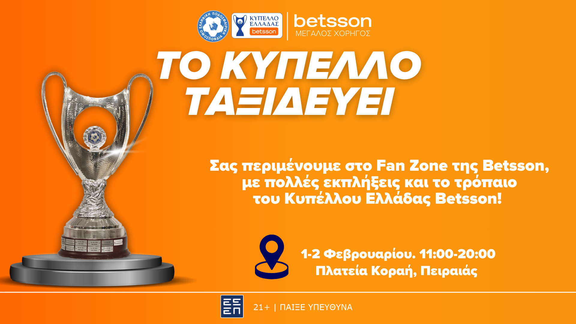 Μια μεγάλη γιορτή που θα συνδυάζει τη χαρά του αθλητισμού με τη διασκέδαση, θα έχουν την ευκαιρία να απολαύσουν οι Πειραιώτες και οι επισκέπτες της πόλης, το Σάββατο 1η και την Κυριακή 2 Φεβρουαρίου, από τις 11:00 έως και τις 20:00, στην πλατεία Κοραή, όπου θα φιλοξενηθεί το τρόπαιο του Κυπέλλου Ελλάδας Betsson, φέρνοντας το πάθος και τη λάμψη του θεσμού κοντά στους φιλάθλους.