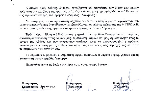 Οι Δήμαρχοι εξέφρασαν την αγανάκτηση των δημοτών που, παρά τις προσπάθειες των Δημοτικών Αρχών της περιοχής εδώ και χρόνια, εξακολουθεί η επέκταση του μετρό να μην βρίσκεται στα σχέδια της Κυβέρνησης.