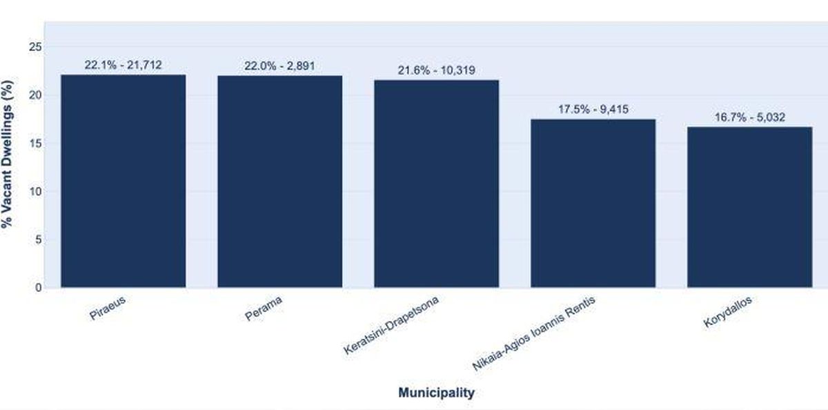 Για τον Δήμο Πειραιά, το ποσοστό των κλειστών διαμερισμάτων φτάνει το 22,1%, που αντιστοιχεί σε 21.172 κατοικίες που παραμένουν ανενεργές. Πρόκειται για ένα από τα υψηλότερα ποσοστά σε ολόκληρο το λεκανοπέδιο, πολύ πάνω από περιοχές των νοτίων και βορείων προαστίων όπου το φαινόμενο παρουσιάζει αισθητή κάμψη. Το γεγονός αυτό συνδέεται τόσο με τη γήρανση του κτιριακού αποθέματος όσο και με τις καθυστερήσεις σε ανακαινίσεις και αξιοποίηση ακινήτων που βρίσκονται σε νομικές ή κληρονομικές εκκρεμότητες.