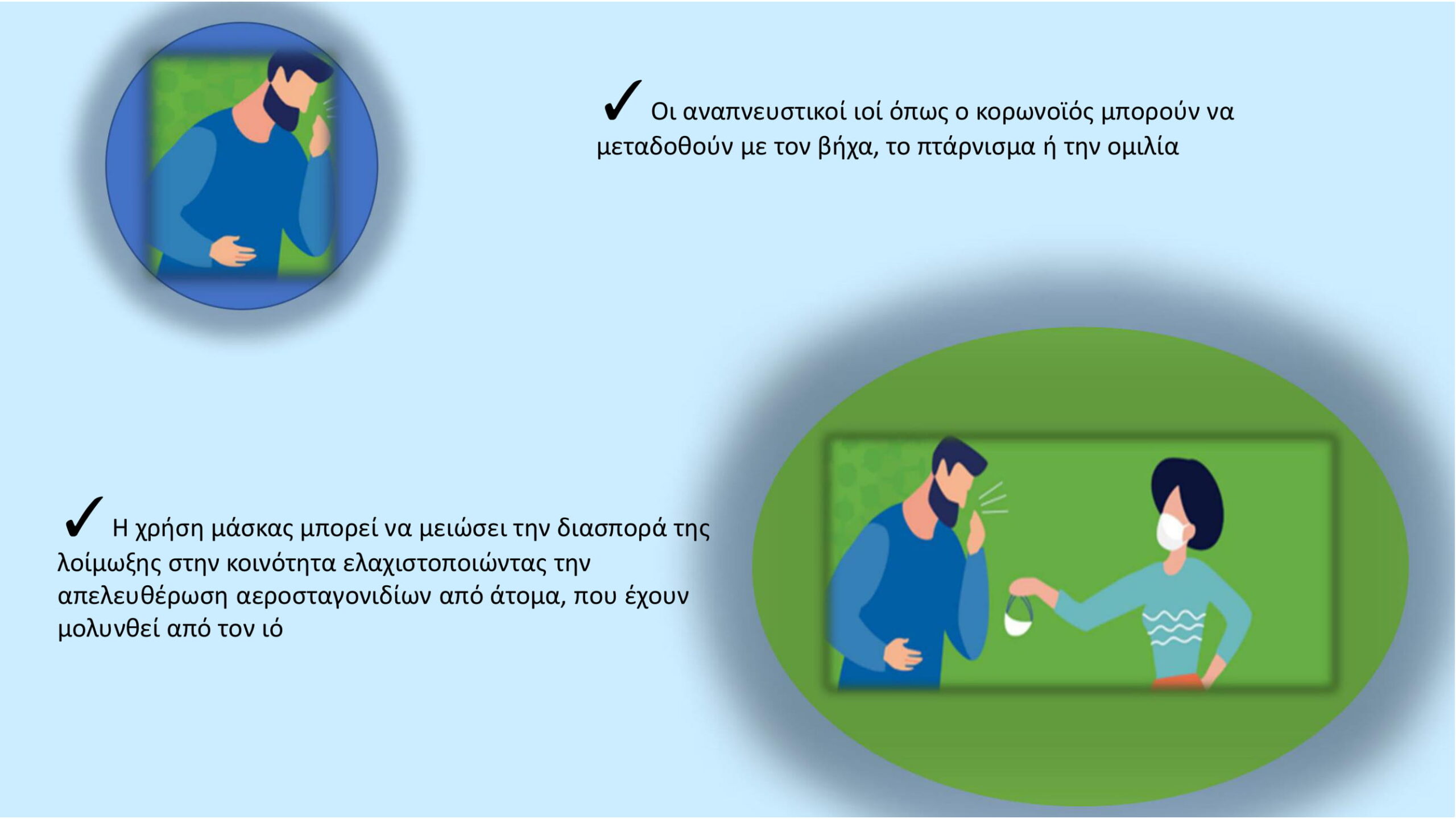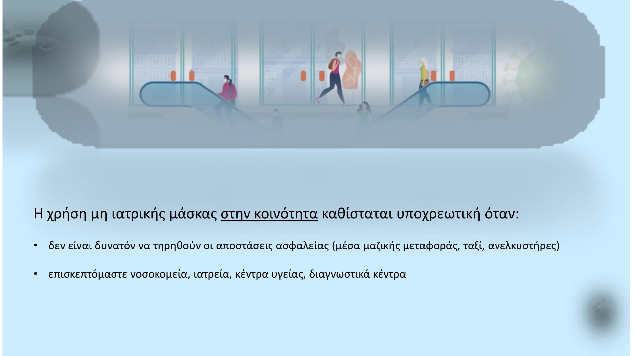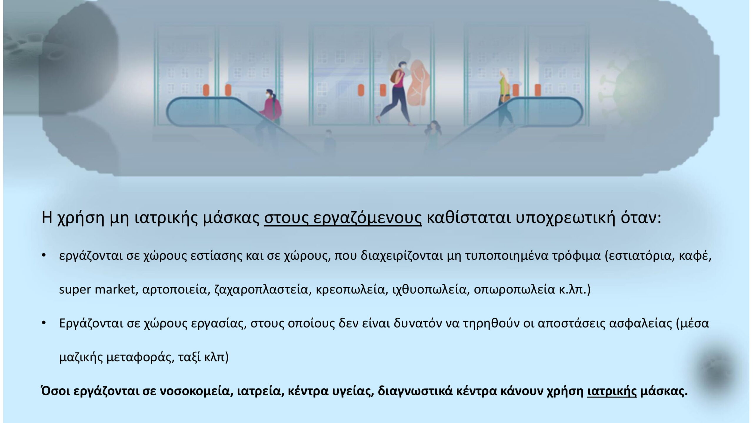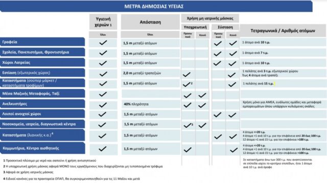Σύμφωνα με τις οδηγίες δημόσιας υγείας (υγιεινή χεριών, αποστάσεις, χρήση μάσκας) τα μέτρα ισχύουν στις βασικές κατηγορίες δημόσιων χώρων όπως είναι τα γραφεία, τα σχολεία, τα πανεπιστήμια, τα φροντιστήρια, οι χώροι λατρείας, η εστίαση, τα καταστήματα, τα Μέσα Μαζικής Μεταφοράς, τα ταξί, οι ανελκυστήρες, οι λοιποί ανοικτοί χώροι, τα νοσοκομεία, τα ιατρεία, τα διαγνωστικά κέντρα, τα καταστήματα λιανικής, τα κομμωτήρια και τα κέντρα αισθητικής.