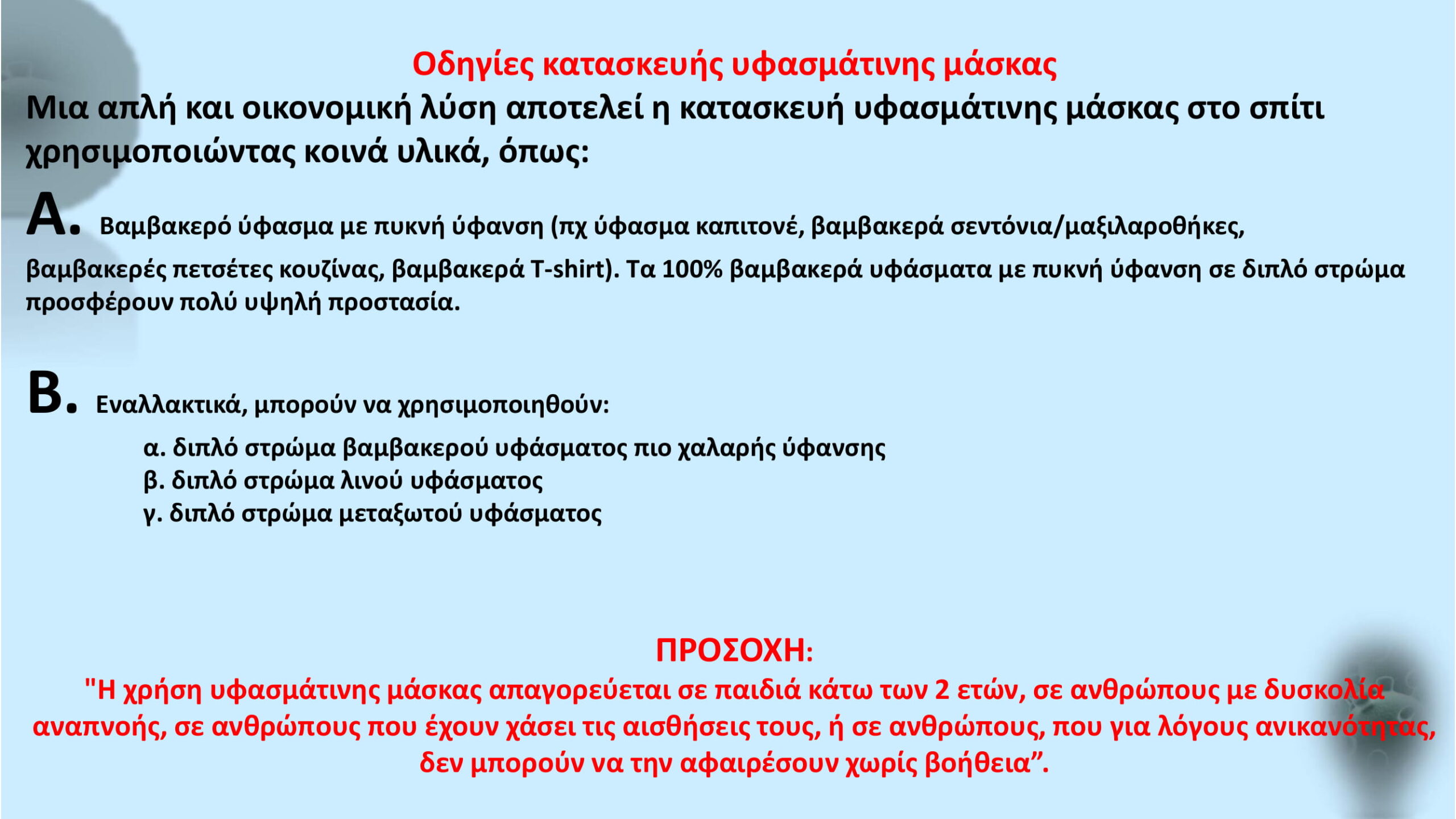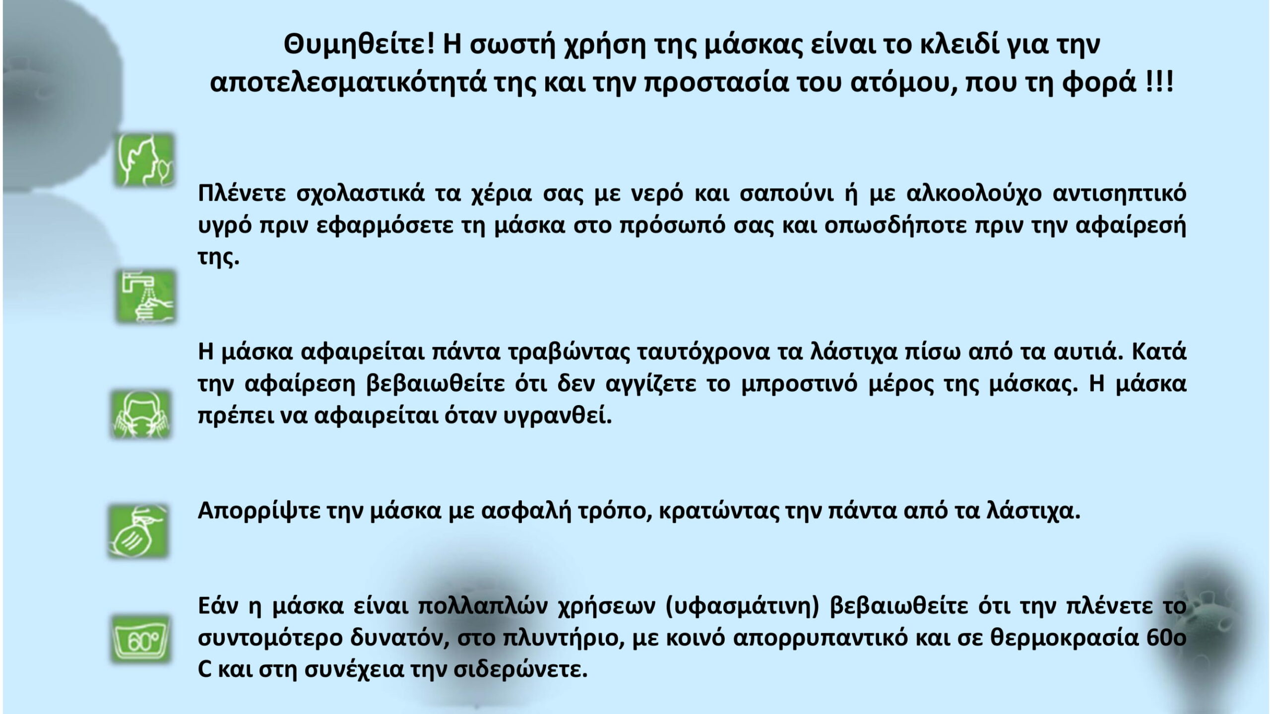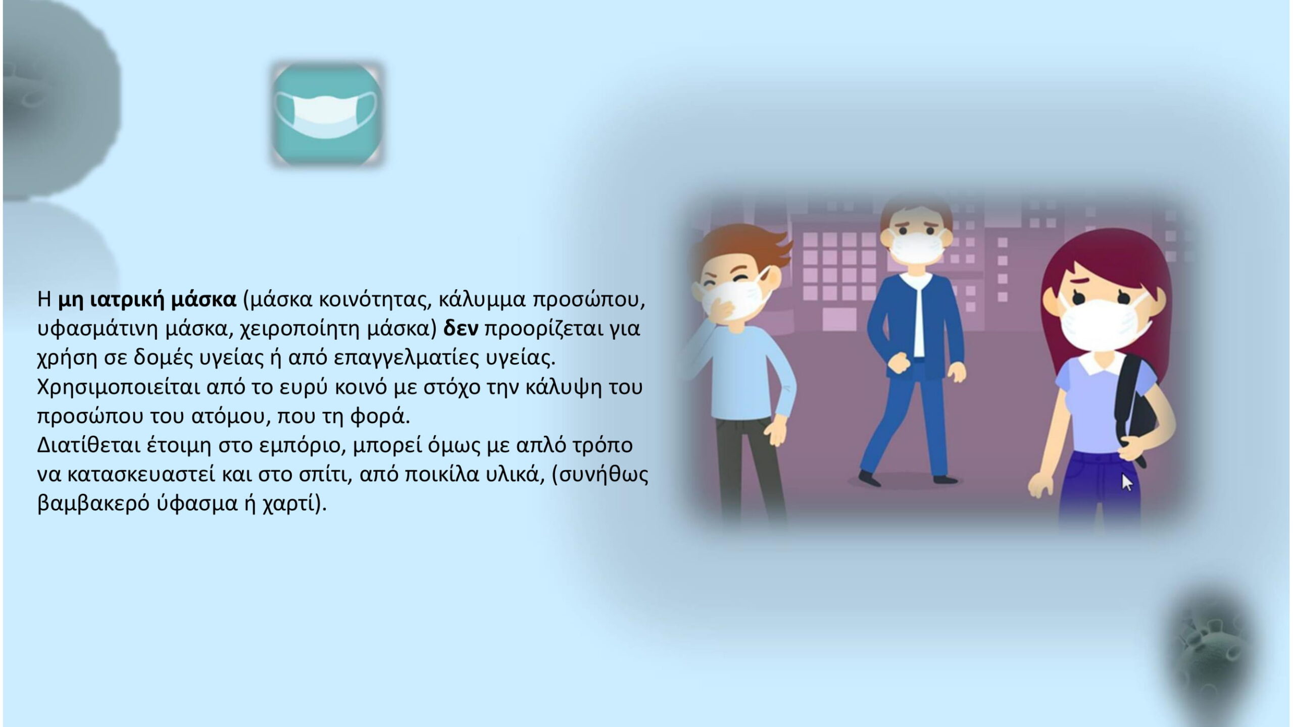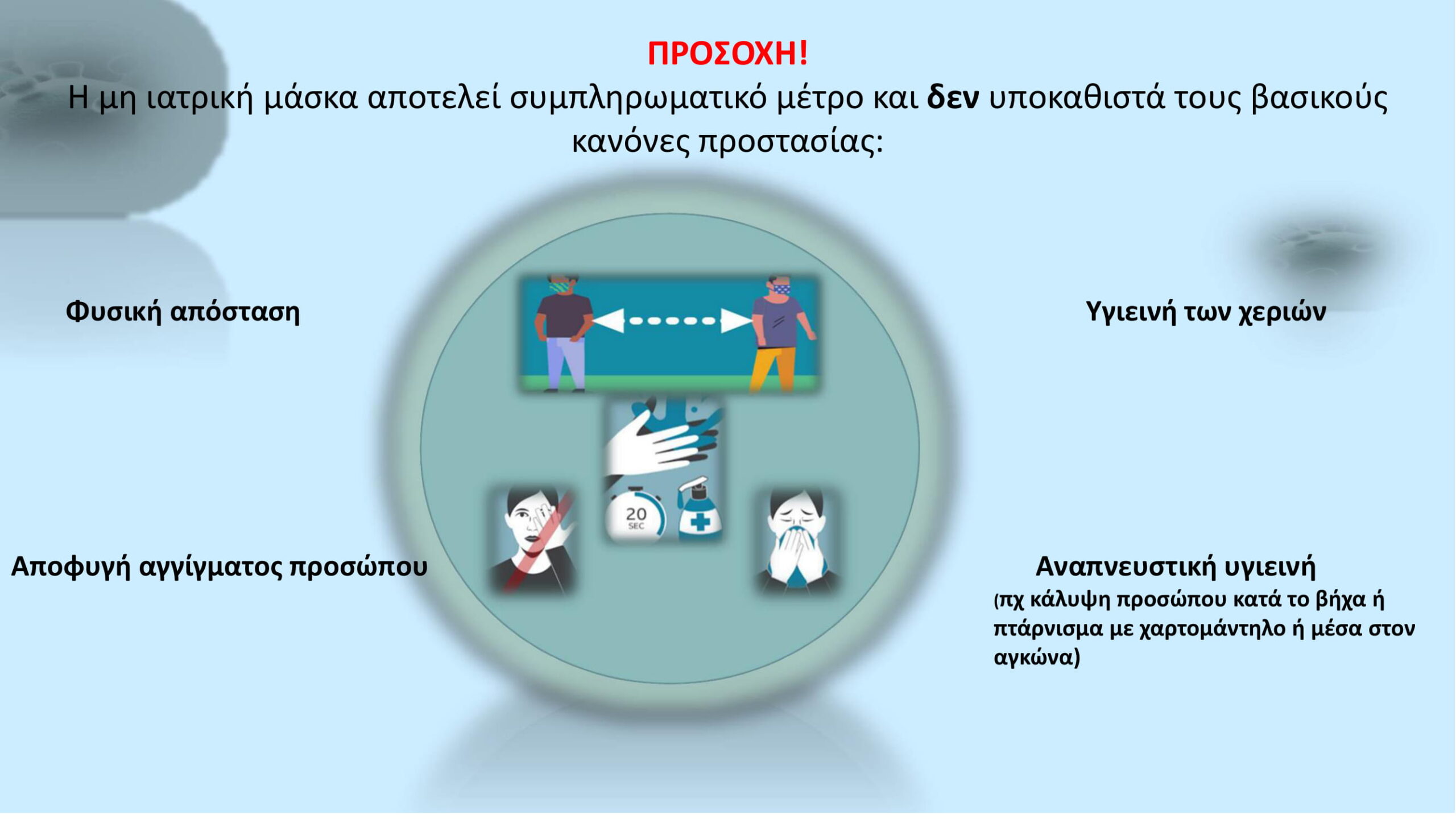 Τις βασικές οδηγίες για τα μέτρα δημόσιας υγείας και τη χρήση μάσκας στους χώρους όπου θα είναι ελεύθερη η πρόσβαση από τη Δευτέρα 4 Μαΐου παραθέτει η υγειονομική επιτροπή όπως αυτά εγκρίθηκαν.