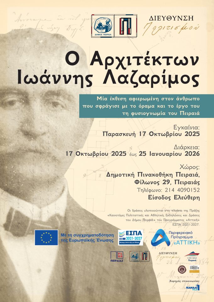 Η Διεύθυνση Πολιτισμού του Δήμου Πειραιά εγκαινιάζει την Παρασκευή 17 Οκτωβρίου 2025, στις 19:30, στη Δημοτική Πινακοθήκη Πειραιά (Φίλωνος 29), την έκθεση «Ο Αρχιτέκτων...