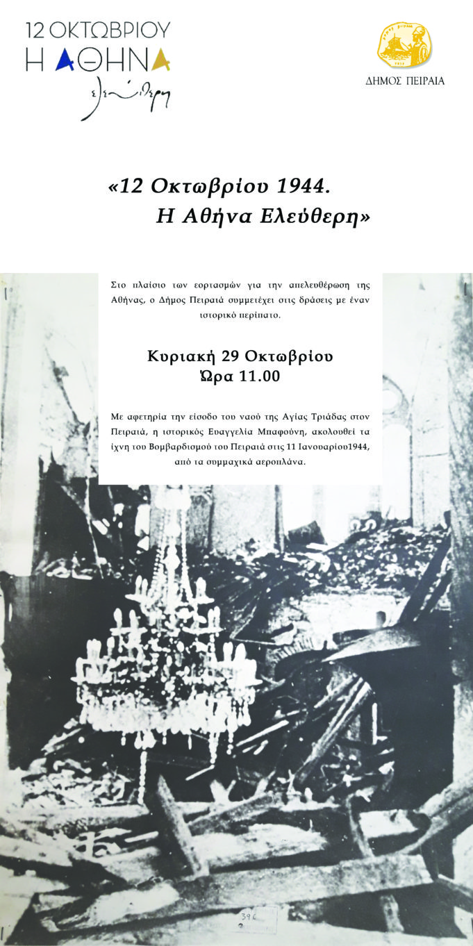 Στo πλαίσιο των εορτασμών για την απελευθέρωση της Αθήνας, η Διεύθυνση Πολιτισμού του Δήμου Πειραιά συμμετέχει στις δράσεις διοργανώνοντας ιστορικό περίπατο, με αφετηρία την...