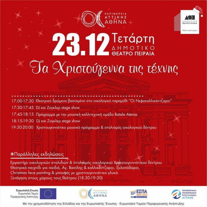 Μια ξεχωριστή Χριστουγεννιάτικη γιορτή με επίκεντρο το Δημοτικό Θέατρο Πειραιά διοργανώνει η ΠΕΡΙΦΕΡΕΙΑ ΑΤΤΙΚΗΣ την Τετάρτη 23 Δεκεμβρίου (προπαραμονή των Χριστουγέννων) στον αίθριο χώρο...