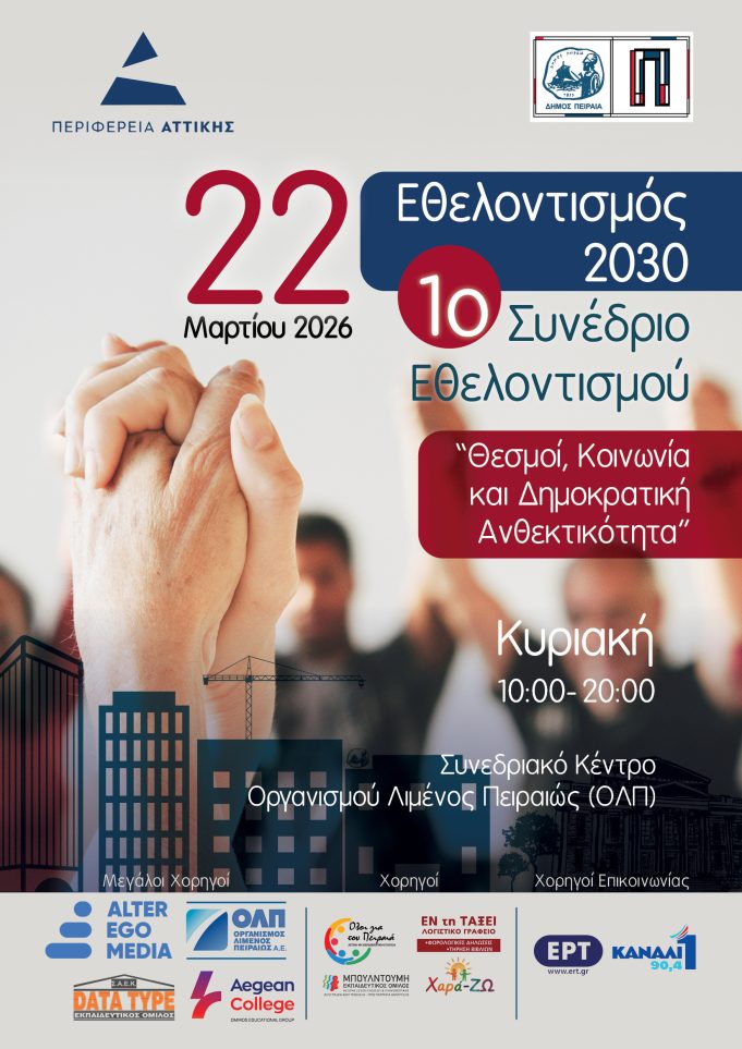 Το συνέδριο «Εθελοντισμός 2030: Θεσμοί, Κοινωνία και Δημοκρατική Ανθεκτικότητα» είναι μια μεγάλη δημόσια εκδήλωση διαλόγου και πολιτικής συζήτησης γύρω από τον ρόλο του εθελοντισμού...