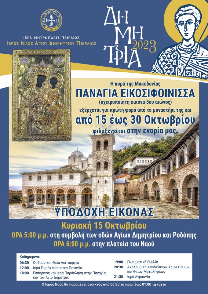 Η Ιερά εικόνα της Παναγίας Εικοσιφοινίσσης τίθεται σε προσκύνηση στον Ιερό Ναό Δημητρίου Πειραιώς έως τις 30 Οκτωβρίου και καθημερινά τελούνται οι Ιερές Ακολουθίες,...
