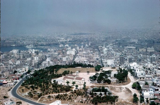 Ο λόφος της Καστέλλας με τον ιερό Ναό του Προφήτη Ηλία και μερική άποψη του Πειραιά απο ψηλά εν έτει 1965.
