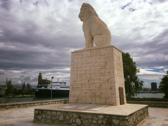 Καθισμένο στα δύο πίσω πόδια του, με το επιβλητικό ανάστημά του και με ορθωμένο το κεφάλι του, το λιοντάρι του Πειραιά δίνει την εντύπωση...