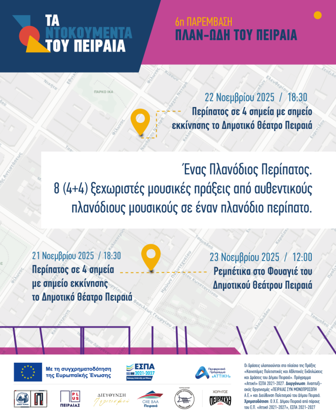Τα «Ντοκουμέντα του Πειραιά» συνεχίζονται αυτή την εβδομάδα με την 6η παρέμβαση, με τίτλο «Πλαν-Ωδή του Πειραιά: ένας πλανόδιος περίπατος με 8 (4+4) ξεχωριστές...