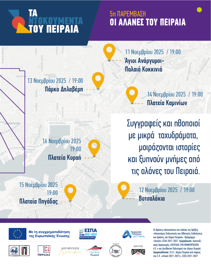 Oι αλάνες του Πειραιά ζωντανεύουν ξανά, σε μια ακόμα καλλιτεχνική παρέμβαση, την 5η κατά σειρά, στο πλαίσιο του νέου φεστιβάλ ΤΑ ΝΤΟΚΟΥΜΕΝΤΑ ΤΟΥ ΠΕΙΡΑΙΑ.