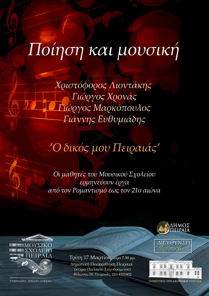 Την επόμενη Τρίτη 17/3/2015 και ώρα 19.30 θα λάβει χώρα στη Δημοτική Πινακοθήκη Πειραιά,μια πολύ όμορφο εκδήλωση ποίησης και μουσικής αφιερωμένη στον Πειραιά. Ο...