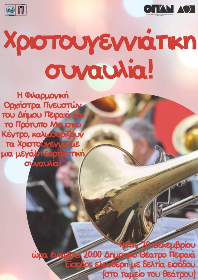 Η Φιλαρμονική Ορχήστρα Πνευστών του Δήμου Πειραιά και το Πρότυπο Μουσικό Κέντρο, καλωσορίζουν τα Χριστούγεννα με μια μεγάλη εορταστική συναυλία που θα πραγματοποιηθεί σήμερα Τρίτη...