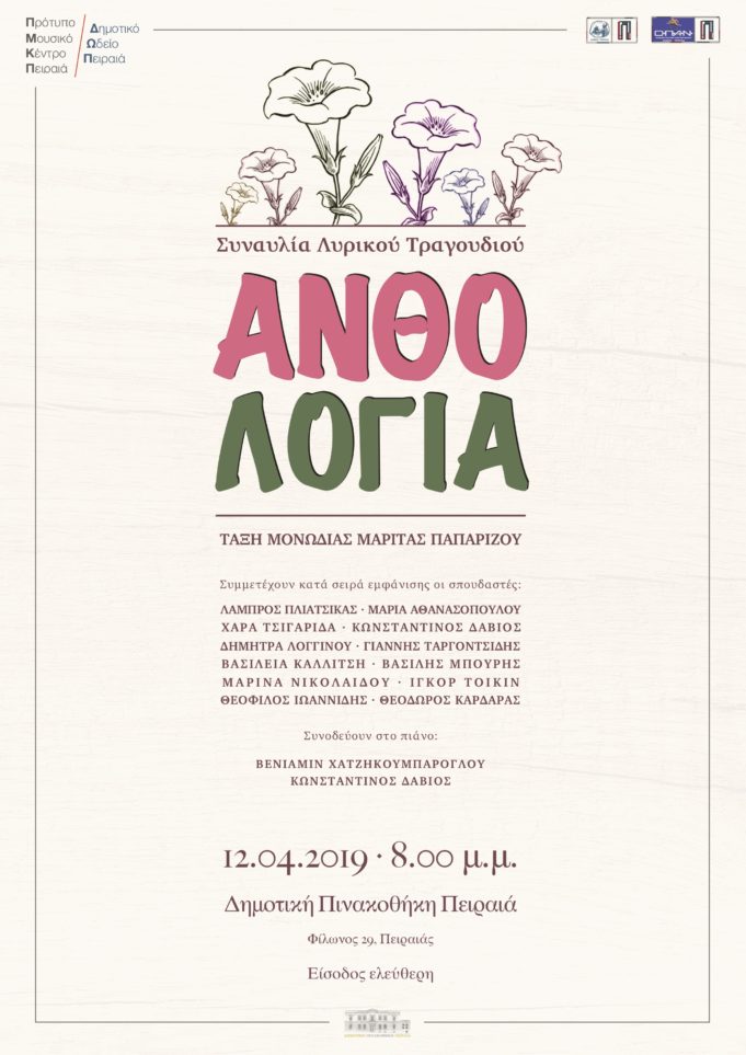 Συναυλία λυρικού τραγουδιού με τίτλο «Ανθολογία», διοργανώνει το Πρότυπο Μουσικό Κέντρο Πειραιά και ο Οργανισμός Πολιτισμού, Αθλητισμού και Νεολαίας του Δήμου, με ελεύθερη είσοδο.