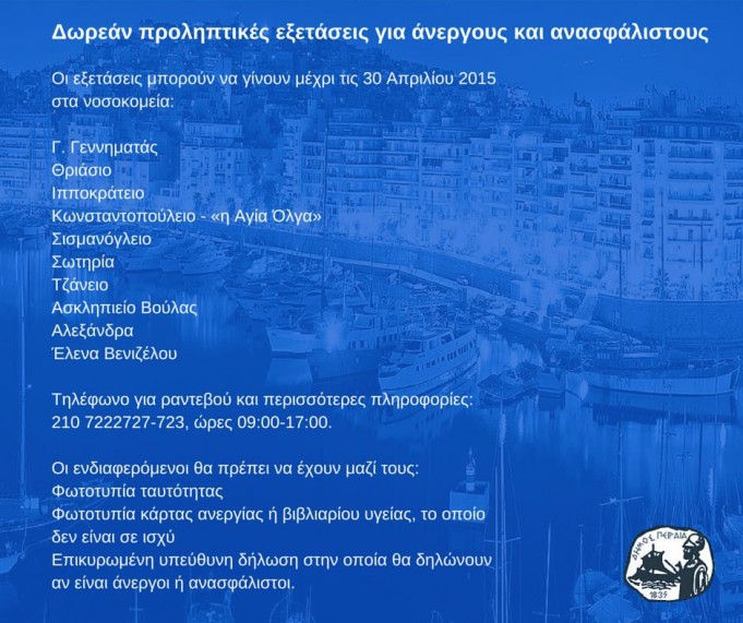 Μέσω του προγράμματος «Πρόληψη για όλους» του Ινστιτούτου Κοινωνικής και Προληπτικής Ιατρικής, ο Δήμος Πειραιώς δίνει τη δυνατότητα σε ανέργους και ανασφάλιστους Πειραιώτες, των...