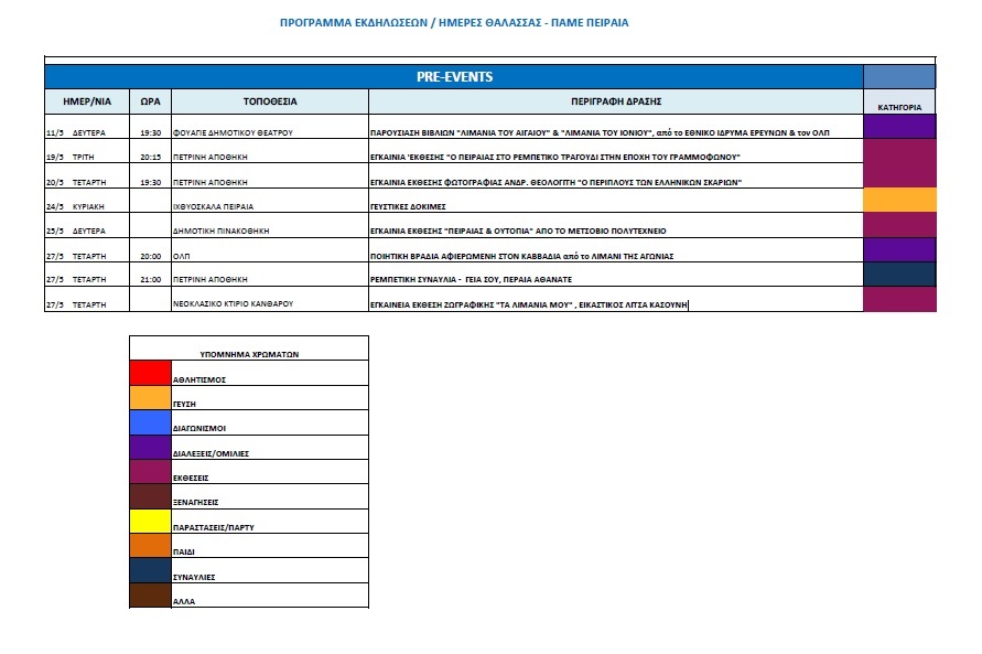 Δημοσίευσε σήμερα η οργανωτική επιτροπή της Ευρωπαϊκής Μέρας Θάλασσας στον ιστότοπό της www.emdpiraeus.gr το μέχρι στιγμής πρόγραμμα του 4ημερου (27-31/5) καθώς και κάποιες εκδηλώσεις (pre-events) που θα γίνουν νωρίτερα μέσα στο Μάιο.