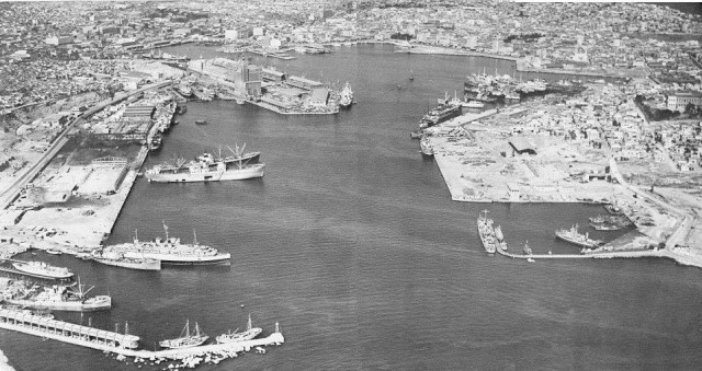 To λιμάνι τα χρόνια της Γερμανικής κατοχής, με πλοία βυθισμένα.